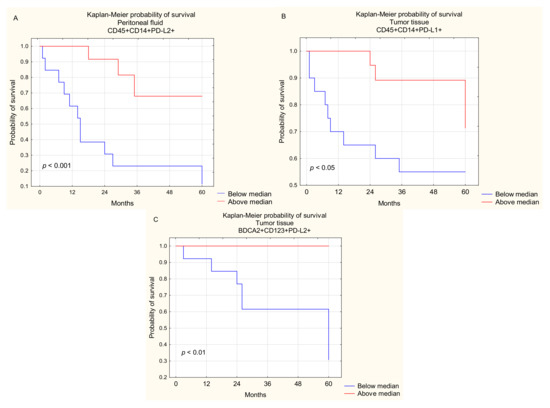 Moreover, the obtained results implicated that OC patients with a higher percentage of plasmacytoid BDCA-2+CD123+PD-L2+ DCs in the tumor tissue had longer OS than patients with a lower percentage of these cell subpopulations (median 42 vs. 43 months; p < 0.01; Figure 10C).