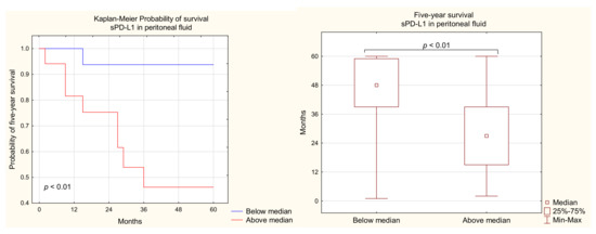 In the present study, we found that OC patients with a higher level of sPD-L1 in the PF had shorter 5-year survival than those with a lower sPD-L1 concentration (median 48 vs. 27 months; Figure 11). There was no significant difference in the OS of the OC patients in relation to the sPD-L1 level in plasma (p > 0.05).