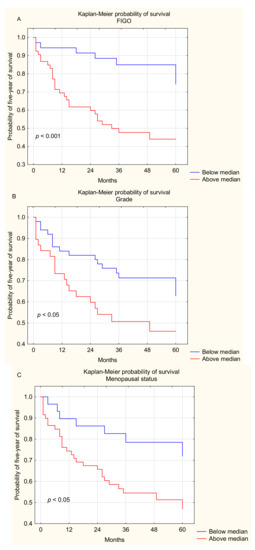 We performed examinations to establish OS estimates as a function of clinical parameters of ovarian cancer patients, including the FIGO stages, grade, type of OC according to Kurman and Shih, menopausal status, and BMI.