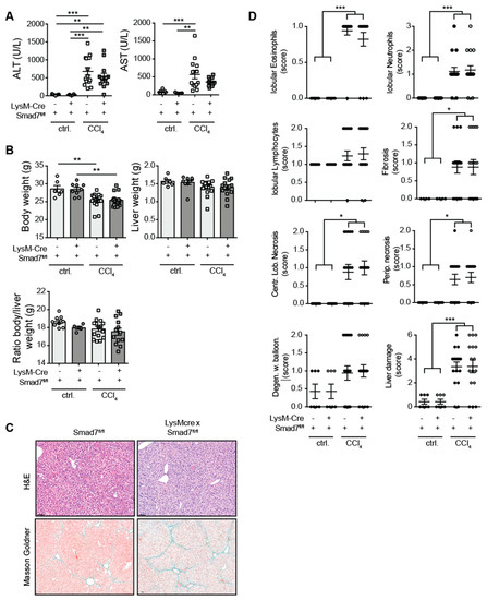 - Endig, J.; Unrau, L.; Sprezyna, P.; Rading, S.; Karsak, M.; Goltz, D.; Heukamp, L.; Tiegs, G.; Diehl, L. Acute liver injury after CCl4 administration is independent of Smad7 expression in myeloid cells. Int. J. Mol. Sci. 2019, 20, 5528. [Google Scholar] [CrossRef] [Green Version]