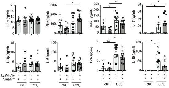 In conclusion, our data suggest that the negative regulator of TGF-β-signalling Smad7, when expressed in myeloid cells, has no influence on the severity of liver damage, the infiltrating myeloid-cell compartment, the cytokine profile of these infiltrating cells and the regenerative response in chronic CCl4-induced liver injury, inflammation and fibrosis.