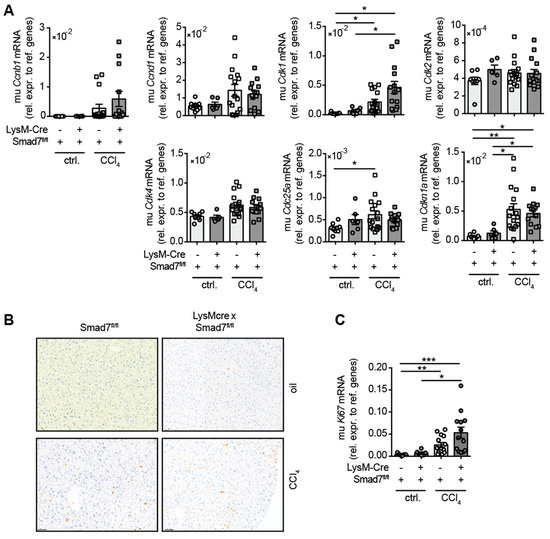 Finally, we examined the effect of myeloid-expressed Smad7 on the capacity of the liver to regenerate during chronic CCl4 application. The liver is known for its regeneration ability via the induction of hepatocyte proliferation and differentiation [22], a process that relies heavily on various signals from cytokines. In this context, TGF-β signalling is known to inhibit regeneration by direct action on hepatocytes [22,23]. Additionally, resolution of injury and fibrosis development in the liver also depends on macrophage phenotype and function [24,25] and other cells from the myeloid lineage, like neutrophils [26] and eosinophils [27,28]. Our analyses revealed that, although there was a general induction of cell cycle genes during CCl4 treatment, there were no clear general changes due to myeloid Smad7 deficiency. Overall, the comparable expression of Ki67 mRNA between LysM-Crepos Smad7Δ/Δ and Smad7fl/fl littermates after CCl4 application (Figure 4) showed that the number of proliferating hepatocytes did not change due to myeloid-specific Smad7 deficiency.