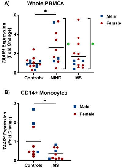 TAAR1 expression in multiple sclerosis (MS) whole peripheral blood mononuclear cells (PBMCs), CD14+ monocytes, and the respective controls. The ΔΔCT method was used to compare TAAR1 expression to the GAPDH housekeeping gene. (A) Brown-Forsythe test showed significant differences between-group variances (* p = 0.0284, F = 4.284). Significant effects were therefore determined by the Kruskal–Wallis test with between-group comparisons by Dunn’s post-hoc multiple comparison test (* p = 0.0168 for NIND vs. Controls, p = 0.4130 for MS vs. Controls). (B) Two-tailed unpaired t test showed a significant difference between the groups (* p = 0.0424, t = 2.194, df = 17). Blue squares denote individual male participants; red circles denote individual female participants.