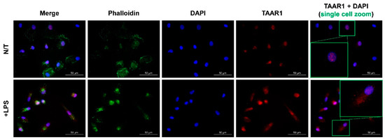 Human CD14+ monocytes were seeded at 100,000 cells/well in 8-well Permanox® Chamber slides (Lab-Tek®; Fisher Scientific; Waltham, MA) and were grown under standard culturing conditions (Section 4.1). For pro-inflammatory stimulation, the culture medium was changed into a serum-free environment (RPMI, 1× GlutaMAX, and 1× P/S) and then treated with lipopolysaccharide (LPS) (Sigma Aldrich, L2880; St. Louis, MO, USA) at 100 ng/mL for 24 h. Following stimulation, macrophages were fixed with 2% formalin for 15 min at room temperature. Fixed macrophages were then washed with 500µL of PBS and permeabilized with 500 µL of 0.3% triton X-100 (ThermoFisher; Waltham, MA, USA) in PBS for 10 min at room temperature. Following permeabilization, cells were blocked with 500 µL of blocking buffer (pH = 7.4; 10% goat serum (ThermoFisher; Waltham, MA) in PBS with 0.1% bovine serum albumin (ThermoFisher; Waltham, MA), 0.3% triton X-100 (ThermoFisher; Waltham, MA), and 0.05% TWEEN® (ThermoFisher; Waltham, MA) for 1 h at room temperature. Next, a previously validated [20] monoclonal mouse anti-human TAAR1 antibody (Hoffman-La Roche, Switzerland) was used at a working concentration of 16.2 µg/mL in immunofluorescence (IF) buffer (pH = 7.4; PBS with 0.1% bovine serum albumin (ThermoFisher; Waltham, MA), 0.3% triton X-100 (ThermoFisher; Waltham, MA), and 0.05% TWEEN® (ThermoFisher)) and incubated with the cells for 16–18 h at 4 °C in the dark. IF buffer without the antibody was used as a “no-primary” negative control. Following primary antibody incubation, the macrophages were washed 3 times for 15 min with 500 µL of PBS. Following washing, macrophages were incubated with 500µL of the secondary antibody solution (PBS with a goat anti-mouse IgG AlexaFluor™ 594-congugated antibody (1:500, Life Technologies; Waltham, MA, A11005), AlexaFluor™ conjugated phalloidin (2 drops/mL, Invitrogen™). and 4′,6-diamidino-2-phenylindole (DAPI; 1:1000)) for 1 h at room temperature in the dark. Following secondary antibody incubation, macrophages were washed 3 times for 5 min with 500 µL of PBS. Next, the chambers were carefully removed, and the slide was coated with 2 drops of Fluoromount—G before applying a coverslip. The slide was then sealed with nail polish and stored in the dark at 4 °C until imaging with a Zeiss AX10 fluorescent microscope at 40× and 63× magnification.