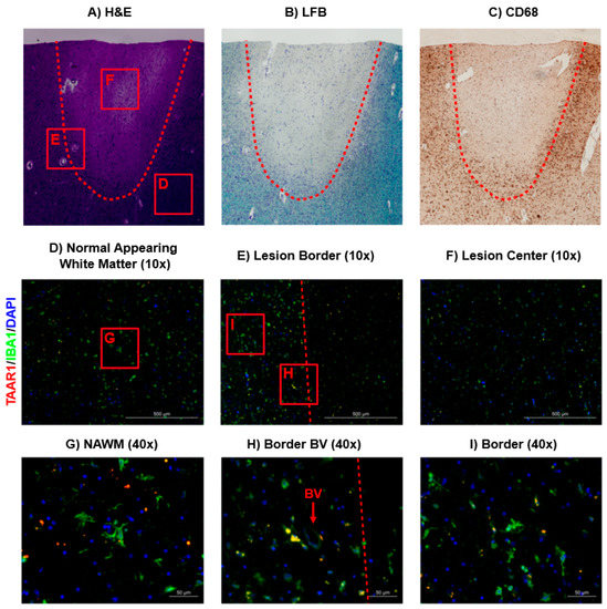 TAAR1 expression profile within and surrounding a mixed active/inactive MS lesion. Bright field images of a mixed active/inactive MS lesion were visualized using H&E (A), LFB (B), and CD68 (C) staining. Primary antibodies for TAAR1 and IBA-1 were used in combination with AlexaFluor™ 594(red) and AlexaFluor™ 647(green) conjugated secondary antibodies to visualize TAAR1 expression and microglia/macrophage localization, respectively (D–I). DAPI staining was used to identify nucleated cells (blue). Co-localization of IBA-1 and TAAR1 can be seen in yellow (D–I). Bright-field images were taken with the Cytation™ 5 Cell Imaging Multi-Mode Reader (BioTek). Fluorescent imaging was conducted with the Zeiss AX10 fluorescent microscope at 10× and 40× magnification and images generated in the built-in Zeiss software; Zen 2 Pro.