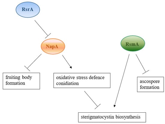 Based on these observations, we can assume that NapA regulates ST biosynthesis via modulating oxidative stress in A. nidulans (Figure 4, Table S4) similarly to ApyapA (A. parasiticus), Aoyap1 (A. ochraceus), and AfyapA (A. fumigatus) [5,7,22,23,24]. Furthermore, RsmA seems to support ST production at low intracellular RS levels [18,19] and, therefore, both oxidative stress-dependent and -independent regulatory elements are likely to modulate ST production in A. nidulans. Additionally, RsmA has a direct impact on ST synthesis by actively binding to and promoting AflR activity, the ST pathway specific regulator [19]. Considering the complex regulatory patterns of NapA and RsmA on the oxidative stress response and secondary metabolite production of A. nidulans, in addition to their impact on each other’s expressions, we can hypothesize that NapA and RsmA are likely to interact with each other either genetically or even physically to coordinate ST production (Figure 5, Table S5).