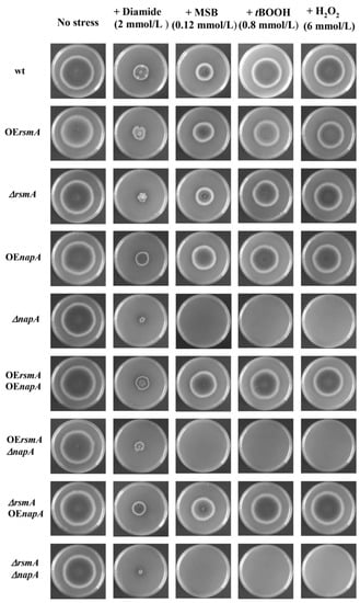 As previously shown, deletion of napA yielded oxidative stress phenotypes in the presence of all tested oxidative stress generating agents, e.g., diamide, MSB, tBOOH, and H2O2, independently of the rsmA gene manipulation. Figure 2, Supplementary Table S1). The effect of napA on the oxidative stress-sensitive phenotype was dependent on the applied stressor, namely, in the presence of MSB decreased, and in the presence of diamide increased, the sensitivity of the mutants, whereas H2O2 sensitivity of the mutants was dependent on the rsmA gene. (Figure 2, Supplementary Table S1). The effect of rsmA deletion or overexpression on the stress sensitivity of the mutants was based on the type of the stress-generating agent and the napA gene (Figure 2, Supplementary Table S1).