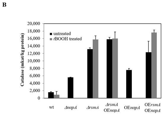 Similar to the catalase activities, no statistically significant differences in ST production were detected between the unstressed and tBOOH-exposed cultures within a given strain (Figure 4, Table S4). After tBOOH treatment, the highest ST levels were measured in the OΕrsmA ΔnapA mutant (Figure 4, Table S4).
