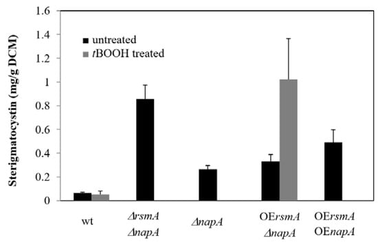 The oxidative stress-sensitive ΔnapA mutant was characterized by increased sterigmatocystin production but, unexpectedly, the highest sterigmatocystin level was observed in the ΔnapA ΔrsmA double deletion mutant (Figure 4, Table S4). As reported before by Shaaban et al. [18], the deletion of rsmA alone may also slightly increase ST production. Previously, Yin et al. [19] reported that overexpression of rsmA resulted in an elevated ST production. Our data suggest that both the reduced and the elevated rsmA can lead to increased ST levels (Figure 4, Table S4).