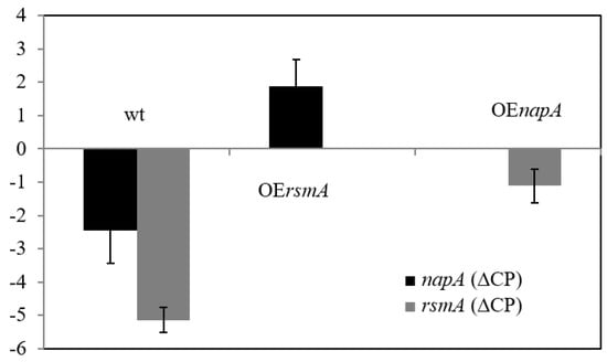 We also examined the effect of rsmA on the expression of wild type napA and vice versa (Figure 5, Table S5). The pairwise comparison of ΔrsmA, control, and OErsmA strains showed that OE of rsmA increased the transcription of napA, whereas OE of napA resulted in elevated rsmA expression (Figure 5, Table S5). Deletion of either rsmA or napA had no significant effect on the transcription of the other gene (Figure 5, Table S5). In the tBOOH-treated cultures of the control strain, the expression of rsmA increased in comparison to the untreated cultures (Table S5).
