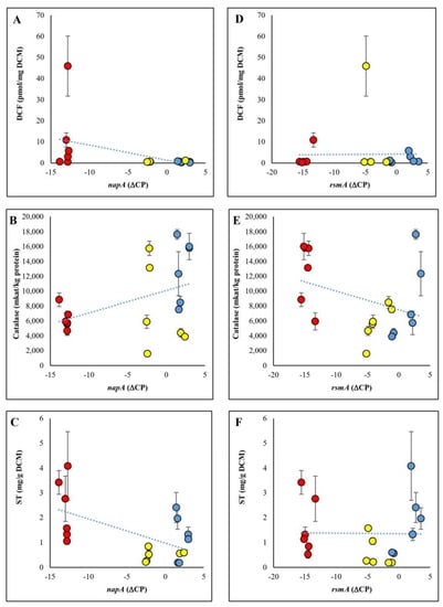 Correlation between relative transcriptions of napA (A–C) or rsmA (D–F) and DCF formations (A,D), specific catalase activities (B,E) or ST productions (C,F).