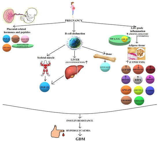 High levels of circulating FABP4 in the serum of pregnant women with GDM may be caused by the additional release of this adipokine from the placenta and adipocytes [155]. It is supposed that overexpression of FABP4 in the placenta may be induced by human placental lactogen and progesterone. Since the concentration of these hormones increases steadily throughout pregnancy, it is thought that it may be associated with an increase in insulin resistance with advancing gestational age [155]. Synergistic release of FABP4 from the placenta and adipocytes may affect both metabolic and inflammatory pathways. This may play a key role in the future development of T2DM in post-partum women [155].