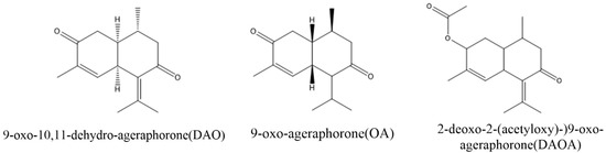 - Liu, X.; Ouyang, C.; Wang, Q.; Li, Y.; Yan, D.; Yang, D.; Guo, M.; Cao, A. Evaluation of antibacterial and anti-fungal properties of 9-oxo-10,11-dehydroageraphorone extracted from Eupatorium adenophorum. J. Plant Dis. Prot. 2016, 123, 93–99. [Google Scholar] [CrossRef]