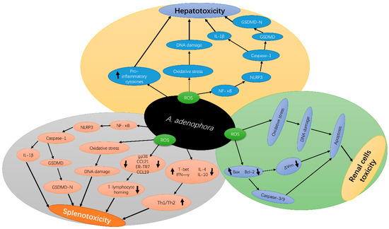 Another current research reported that A. adenophora causes toxicity in the spleen by destroying the fibroblastic reticular cell (FRC) network and causing an imbalance in the Th1–Th2 cell ratio [33]. The study speculated that A. adenophora ingestion induces a persistent inflammatory response in the spleen, which in turn could lead to the activation and promotion of T cell immunity, resulting in splenic dysfunction. However, the mechanism behind these observations is not yet clear. Therefore, it requires further studies. Another study by Cui et al. [47] also reported that A. adenophora causes destruction of the intestinal structure and immune barrier integrity. In summary, A. adenophora induces inflammation in cells, which leads to cell death mediated by pyroptosis. Figure 2 depicts the molecular mechanisms of A. adenophora—induced toxicity in various organs.