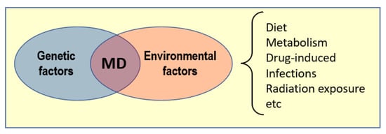 Most of the chronic and progressive diseases that lead to high morbidity and mortality are multifactorial in nature and involve the accumulation of biological disfunctions that result in diverse tissue and organ damages [6]. Some of these are cardiovascular, cerebrovascular and neurodegenerative disorders, and immune-, metabolic-, and infection-induced diseases [7,8,9,10,11,12,13,14,15]. Many factors, both genetic and environmental, can contribute to the onset and development of multifactorial diseases (MD, Figure 1).