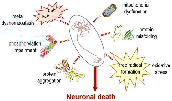 The chronological hierarchy of the events associated with the underlying causes leading to NDD are not fully understood yet [18]. However, the gathered evidence strongly indicates that one can potentiate the other, leading to a self-sustaining cycle that ultimately provokes neuronal death processes [20].