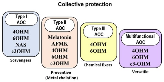 The combined protection of melatonin and its metabolites is widely known [109] and usually referred to as a cascade-like protection [110,111,112]. This collective antioxidant capacity (AOC) implies that melatonin can deactivate more than one equivalent of oxidants. This is a multifaceted process that involves free radical scavenging processes (Type I AOC) and metal chelation (Type II AOC) [113]. It has been proposed that the collective action of melatonin and its metabolites takes place in a “task-division” manner (Figure 3). Some members of this family are expected to perform particularly well as free radical scavengers, whereas others (including melatonin itself) would be more efficient as metal chelators [114].