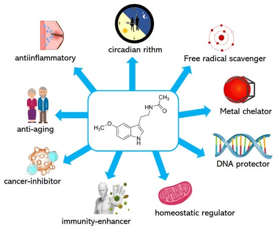 Melatonin is a ubiquitous and versatile molecule. In addition to being produced by the pineal gland, it is also found in many other organs, including the skin, retina, cerebellum, kidneys, liver, pancreas, and ovaries [85,86,87,88,89,90]. It has immune-enhancing and anti-inflammatory properties [91,92,93], can inhibit cancer progression [94,95,96], and plays homeostatic roles in the mitochondria [97,98,99].