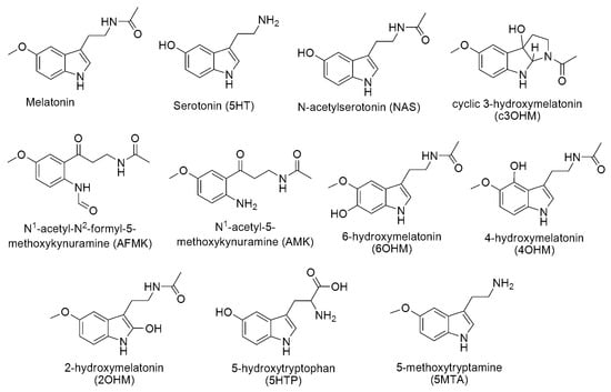 N1-acetyl-5-methoxykynuramine (AMK), N1-acetyl-N2-formyl-5-methoxykynuramine (AFMK), cyclic 3-hydroxymelatonin (c3OHM), 5-methoxytryptamine (5MTA), and 6-hydroxymelatonin (6OHM) are melatonin’s metabolites. These are produced not only by metabolic routes, but also from the melatonin-mediated free radicals’ detoxification. It is assumed that c3OHM is formed as a result of the reaction between melatonin and the hydroxyl radical [173]. AFMK is yielded when c3OHM further reacts with other free radicals. The virtuous AOC process continues and AMK is a product derived from the radical scavenging reactions of AFMK [174]. By comparison, in mammals, 2-hydroxymelatonin (2OHM) and 4-hydroxymelatonin (4OHM) are the result of the melatonin’s metabolism induced by UV radiation [175]. In plants, 2OHM is enzymatically produced and the most abundant metabolite of melatonin [176].