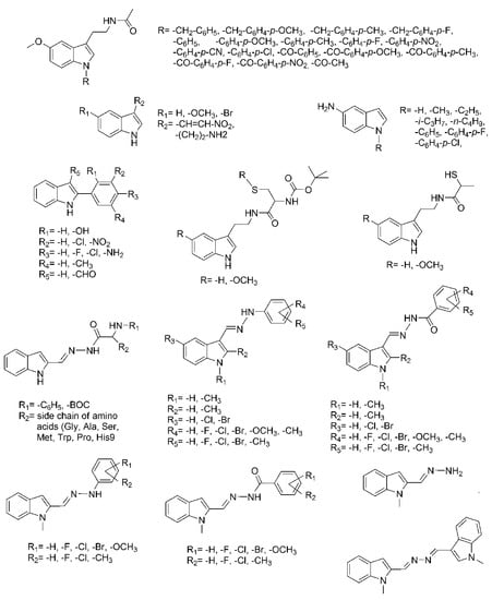 The AOC of several melatonin derivatives obtained from functionalization with the sulfhydryl group has been tested, and some of these were proven to have improved antioxidant protection compared to melatonin [223]. Melatonin derivatives containing retinamide [224], 2-phenylindole [225], indole-3-propionamides [226], and N-methylindole plus hydrazide/hydrazone [227] moieties were reported to inhibit lipid peroxidation. Chloroindole hydrazide/hydrazone melatonin derivatives were found to be highly efficient as free radical scavengers [228]. Modifications in the methoxy and acylaminoethyl groups of melatonin have been also pursued as promising synthetic routes to produce compounds with enhanced AOC compared to melatonin [229]. Indole amino acid derivatives of melatonin have been produced and tested for AOC. Their performance as DPPH (2,2-difenil-1-picrylhydrazyl) scavengers was found to be similar to that of melatonin, whereas their efficiency as inhibitors of lipid peroxidation was higher [230].