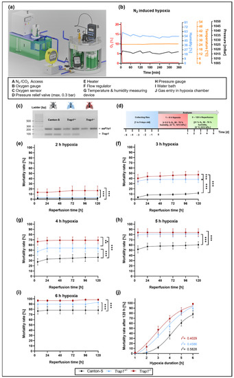 Mortality rates of Canton-S, Trap1+/− and Trap1−/− flies subjected to different durations of monitored N2-induced hypoxia (<0.3% O2). (a) Hypoxia chamber used for the experiments. Illustration of hypoxia chamber and environmental conditions modified from Habib et al. 2021 (b) Hypoxia conditions at 23 °C with controlled oxygen levels, pressure, and humidity. (c) Genotypes of flies assessed by PCR. (d) Schematic illustration of the hypoxia-reperfusion protocol. (e–i) Death rates of Canton-S, Trap1+/− and Trap1−/− after 1 to 6 h of severe hypoxia (<0.3% O2) followed by a reperfusion period of 120 h. (j) Nonlinear regression of the hypoxia duration-dependent death rates of Canton-S, Trap1+/− and Trap1−/− D. melanogaster. Data are shown as means SEM of 4 independent experiments, including 3 technical replicates per genotype and experiment (total of 240 male flies for each genotype and condition). Repeated measurements one-way ANOVA followed by Tukey post-hoc. * p < 0.05., ** p < 0.01, *** p < 0.001.