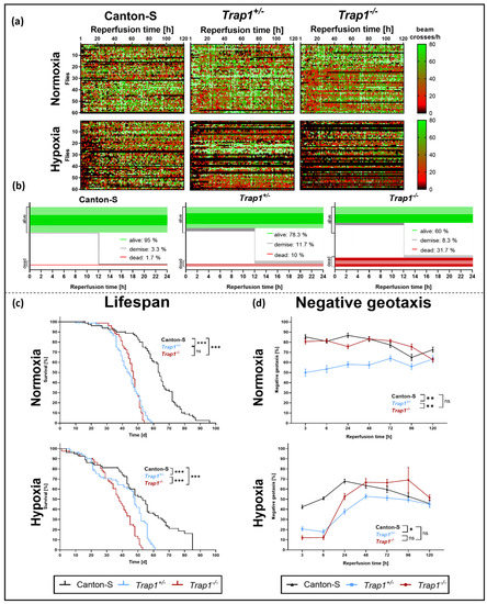 In conclusion, Trap1 deficiency leads to a significantly lower lifespan in both normoxia and hypoxia and negatively affects the activity and negative geotaxis.