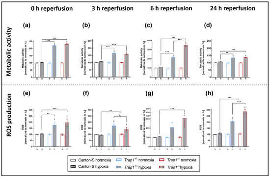 To assess the metabolic activity, we performed a CellTiter-Blue® Cell Viability Assay after 3 h of hypoxia and different reperfusion times. While no difference between the genotypes was observed under normoxic conditions, the metabolic activity of both Trap1+/− and Trap1−/− flies was significantly enhanced after hypoxia compared to the corresponding normoxia control at every reperfusion time point (p < 0.0001), peaking at 6 h of reperfusion in the Trap−/− flies. Meanwhile, Canton-S displayed no difference in metabolic activity between hypoxia and normoxia (Figure 3a–d).