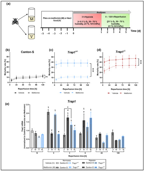 To assess the effect of Metformin treatment on Trap1-deficient flies after hypoxia, we transferred the newly hatched flies on Metformin-supplemented or NaCl vehicle control food up to 5 days and performed 3 h of severe hypoxia followed by 120 h of reperfusion (Figure 4a). We did not observe any differences in the mortality rate of Canton-S between the treated and the vehicle control group. However, Trap1-deficient flies showed a significant decrease in post-hypoxic mortality after Metformin treatment (p = 0.0002). Trap1-deficient flies of the vehicle group reached a mortality rate of 47.18% (Trap1−/−) and 38.18% (Trap1+/−) during the first 5 days after hypoxia. When treated with Metformin, there was a reduction in mortality of 28.57% and 70.53% to 33.75% in Trap1−/− and 11.25% in Trap1+/− (Figure 4b–d).