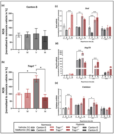 The enzymes Superoxide dismutase (SOD), Heat shock protein 70 (HSP70), and Catalase are known to play a role in the antioxidant defense system, which is assumed to influence oxidative stress. To further investigate oxidative stress, we measured the mRNA levels of Sod, Hsp70, and Catalase in the heads of flies after 3 h of severe hypoxia followed by up to 120 h reperfusion. Under normoxic conditions, no differences could be observed between the different genotypes in the vehicle group. After hypoxia, however, Trap1−/− flies showed a significant increase in Sod (p = 0.0004) and Hsp70 (p < 0.0001) expression levels during the first 24 h of reperfusion compared to normoxia, peaking directly after hypoxia at 0 h of reperfusion, whereas Canton-S flies only displayed a significant upregulation of Hsp70 directly after hypoxia (p < 0.0001), which normalized throughout the reperfusion period. Moreover, the mRNA levels of Sod, Hsp70, and Catalase were significantly higher in Trap1-deficient flies at nearly all reperfusion times compared to Canton-S. Metformin treatment significantly elevated Sod and Catalase expression levels in Trap1−/− flies under normoxic conditions (p < 0.0001). However, Metformin significantly reduced post-hypoxic Hsp70 (p < 0.0001) in Trap1−/− flies in the early reperfusion phase (Figure 5c–e). Our results suggest that Metformin rescues the deleterious effects of Trap1 deficiency by reducing ROS production and displays lower levels of antioxidant proteins.