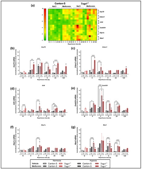 Post-hypoxic mRNA levels of proteins involved in the UPR pathway in Canton-S and Trap1−/− D. melanogaster after exposure to 3 h of hypoxia. (a) Heatmap displaying the mRNA levels of Grp78, Edem1, Atf4, Gadd34, Xbp1s, and Manf in Canton-S and Trap1−/− at different post-hypoxic reperfusion timepoints (0, 3, 6, 24, and 120 h after hypoxia) as a summary of the results of (b–g). Target genes are presented as ratios to the constitutive gene eEF1α1 and normalized to the vehicle Canton-S normoxia. (b–e) Graphs showing the mRNA expression levels of UPR markers. Target genes are presented as ratios to the constitutive gene eEF1α1 and normalized to the vehicle Canton-S normoxia. V: vehicle (NaCl) and M: Metformin. Statistics: Two-way ANOVA followed by Tukey post-hoc. * p < 0.05., ** p < 0.01, *** p < 0.001. # p < 0.05 indicates significance compared to the corresponding vehicle. § p < 0.05 indicates significance compared to corresponding normoxia.