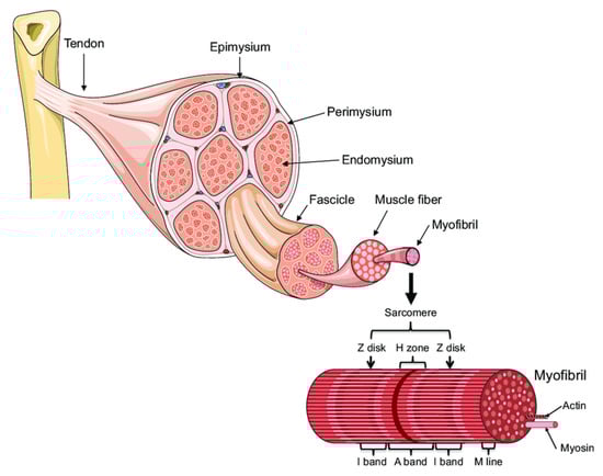 Muscle organization (A. Bonetta and LF Bonewald, originally adapted from Servier Medical Art—https://smart.servier.com/smart_image/tendon-anatomy/ accessed on 1 October 2021) [3].