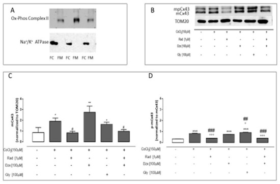 Confluent H9c2 cells were treated for 3 h with CoCl2 (150 µM) in DMEM 10% FBS. Radicicol (1 µM) was used to inhibit Cx43 translocation to mitochondria, dzx (100 µM) and gly (100 µM) were used induce the opening or closure, respectively, of ATP-regulated potassium channels (KATP). Dzx, gly or radicicol were added 30 min before the CoCl2 treatment and left in the incubation medium for the entire experiment time.