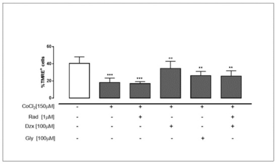 In order to evaluate mitochondrial membrane depolarization, we used the cationic dye TMRE, which is trapped in mitochondria and emits fluorescence in inverse proportion to mitochondrial membrane potential. As reported in Figure 3, CoCl2 significantly (p < 0.001 vs. untreated cells) induced mitochondrial membrane depolarization; indeed, the percentage of TMRE positive cells is lower than control cells. Additionally, in radicicol-treated cells, as well as in gly-treated cells, a significant (p < 0.005 and p < 0.05 vs. untreated cells) mitochondrial membrane depolarization was observed. Following the activation of mitochondrial KATP channels through dzx pre-treatment a significant (p < 0.005) improvement in mitochondrial membrane potential was observed compared to the cells treated with CoCl2 alone (Figure 3).