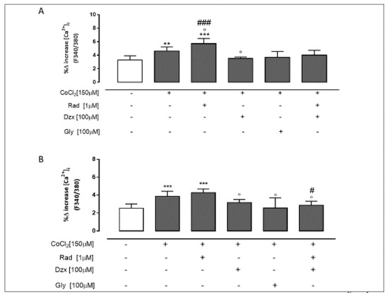 Mitochondrial Cx43 and the opening of mitochondrial KATP channels prevent CoCl2-induced Ca2+ homeostasis alteration. Cells were treated for 3 h with CoCl2 (150 µM); rad (1 µM), dzx (100 µM) and gly (100 µM) were added 30 min before CoCl2 administration. Panel (A) show the intracellular calcium content valued on H9c2 cells in calcium-free medium by means of ionomycin (1 μM). Mitochondrial calcium pool was detected on H9c2 cells in calcium-free medium in presence of FCCP (50 nM) (panel (B)). Data were expressed as mean ± S.E.M. of delta (δ) increase in FURA-2 ratio fluorescence (340/380 nm) from at least three independent experiments, each performed in triplicate. Data were analysed by one way ANOVA and multiple comparisons were made by Bonferroni post-test. ** p < 0.005 and *** p < 0.001 vs. untreated; ° p < 0.05 vs. CoCl2-treated cell; # p < 0.05 and ### p < 0.001 vs. CoCl2 and dzx co-treated cell.