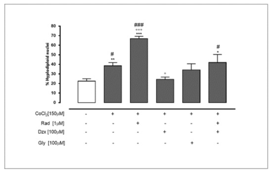 Mitochondrial Cx43 and the opening of mitochondrial KATP channels counteract CoCl2-induced apoptotic response. Cells were treated for 3 h with CoCl2 (150 µM); rad (1 µM), dzx (100 µM) and gly (100 µM) were added 30 min before CoCl2 administration. H9c2 were stained by propidium iodide and fluorescence of individual nuclei was measured by flow cytometry. Results are expressed as mean ± S.E.M. of percentage of hypodiploid nuclei from at least three independent experiments, each performed in duplicate. Data were analysed by one way ANOVA and multiple comparisons were made by Bonferroni post-test. * p < 0.05, ** p < 0.005 and *** p < 0.001 vs. untreated cells; ° p < 0.05 and °°° p < 0.001 CoCl2-treated cell; # p < 0.05 and ### p < 0.001 vs. CoCl2 and dzx co-treated cell.