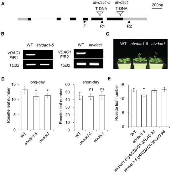 VDACs play important roles in plant growth, but whether VDACs are involved in flowering-time control is unknown. To identify the functions of AtVDAC1 during the floral transition, we used the atvdac1-5 mutant (SALK_058473) and atvdac1 mutant (SALK_034653), which contain an insertion in the fifth exon and sixth exon, respectively (Figure 1A). They were identified as knock-out mutants (Figure 1B). atvdac1-5 and atvdac1 exhibited early-flowering phenotypes compared to WT seedlings under long-day conditions (Figure 1C,D), while atvdac1-5 and atvdac1 displayed comparable flowering times to WT seedlings under short-day conditions (Figure 1D), suggesting that AtVDAC1 inhibits the floral transition.