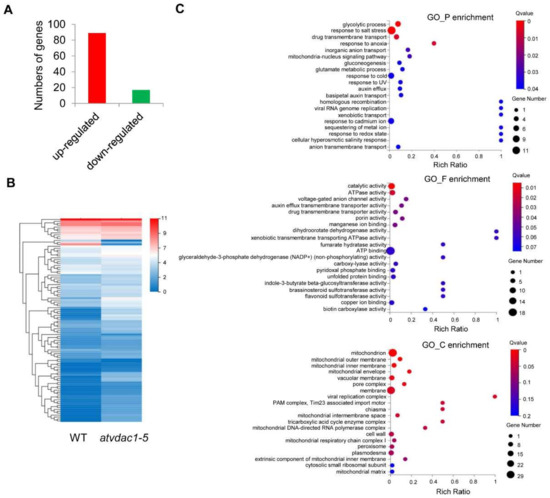 Transcriptional profiles in WT and atvdac1-5 mutant seedlings at 9 DAG (A) The numbers of genes that were up-regulated or down-regulated between WT and atvdac1-5 mutant seedlings at 9 DAG. (B) Expression profiles of the DEGs between WT and atvdac1-5 mutant seedlings at 9 DAG shown using a heatmap. (C) GO term enrichment analysis of the DEGs between WT and atvdac1-5 mutant seedlings.
