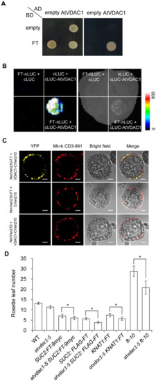 To construct the vectors for the yeast two-hybrid assays, the coding regions of AtVDAC1 and FT were amplified and cloned into pGADT7 and pGBKT7, respectively. The yeast two-hybrid assay was performed using the Yeastmaker Yeast Transformation System 2, in accordance with the manufacturer’s instructions (Clontech, Palo Alto, CA, USA). The yeast two-hybrid assay was performed three times. All the primers used for generating these constructs are listed in Table S2.