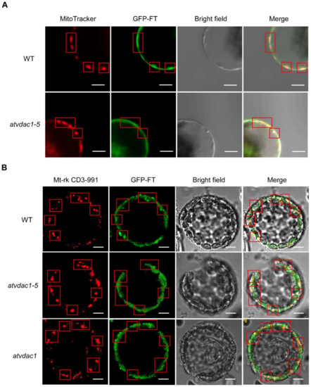 Subcellular localization of GFP-FT in WT, atvdac1-5, and atvdac1 protoplast. Arabidopsis protoplasts were transfected with SUC2:GFP-FT. Mitochondrial marker, MitoTracker (A) or Mt-rk CD3-991 (B). Scale bar: 20 μm. Red rectangles indicated the location of mitochondria.