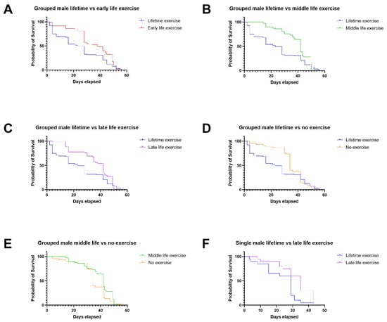 Percentage probability of survival for grouped and single male flies: (A) Grouped male flies’ lifetime exercise vs. early-life exercise (n = 93, 95, respectively) (log-rank test p = 0.0011). (B) Grouped male lifetime vs. middle-life exercise (n = 93, 78, respectively) (log-rank test p = 0.0014). (C) Grouped male lifetime vs. late-life exercise (n = 93, 121, respectively) (log-rank test p = 0.0050). (D) Grouped male lifetime vs. no exercise (n = 93, 87, respectively) (log-rank test p = 0.0237). (E) Grouped male middle-life vs. no exercise (n = 78, 87, respectively) (log-rank test p = 0.0125). (F) Single male lifetime vs. late-life exercise (n = 20, 20, respectively) (log-rank test p = 0.0053).
