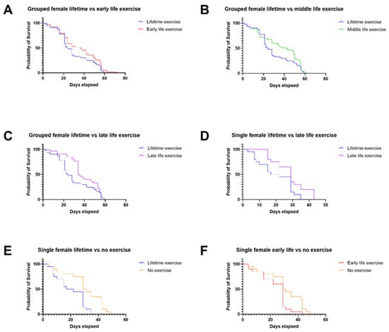 Percentage probability of survival for grouped and single female flies: (A) Grouped female lifetime vs. early-life exercise (n = 94, 121, respectively) (log-rank test p = 0.0094). (B) Grouped female lifetime vs. middle-life exercise (n = 94, 127, respectively) (log-rank test p = 0.0141). (C) Grouped female lifetime vs. late-life exercise (n = 94, 85, respectively) (log-rank test p = 0.0241). (D) Single female lifetime vs. late-life exercise (n = 20, 20, respectively) (log-rank test p = 0.0202). (E) Single female lifetime vs. no exercise (n = 20, 20, respectively) (log-rank test p = 0.0025). (F) Single female early-life vs. no exercise (n = 20, 20, respectively) (log-rank test p = 0.0202).