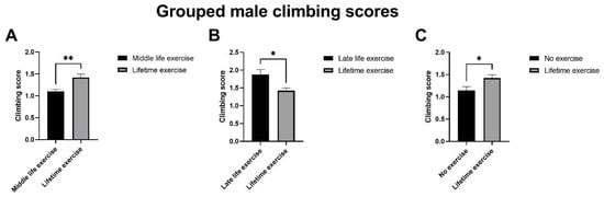 Grouped male Drosophila under different exercise regimens produced different climbing scores when compared with lifetime exercise: (A) Lifetime exercise vs. middle-life exercise (n = 6) (unpaired t-test, p = 0.0051, ** = <0.01). (B) Lifetime exercise vs. late-life exercise (n = 6) (unpaired t-test, p = 0.0183, * = < 0.05). (C) Lifetime exercise vs. no exercise (n = 6) (unpaired t-test, p = 0.0344, * = < 0.05).