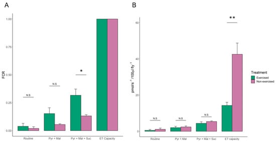 (A) Flux control ratio (FCR), in exercised and non-exercised male D. melanogaster; and (B) specific flux oxygen consumption in exercised and non-exercised male D. melanogaster (n = 3). Significant p-values: (A) succinate p-value = 0.025; (B) ET capacity p-value = 0.002. N.S = >0.05, * = <0.05, ** = < 0.01.