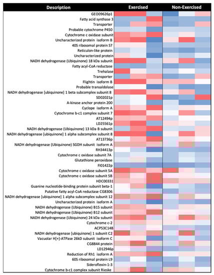 Representative heatmap of mitochondrial proteins with increased abundance (RAR of >1.5) after 1 week of exercise in D. melanogaster (n = 3). Red-to-blue colour gradient represents high-to-low relative protein abundance. The proteomic approach used was label-free mass spectrometry. All proteins listed were classified as significant as per the criteria described in the results.