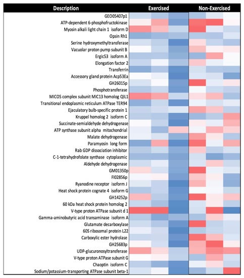 Of the 515 proteins identified, 424 had significant differences in abundance between the groups that were analysed (>23.52 −log10P, >1% FDR). A total of 337 proteins were quantified in all three replicates of the exercised and non-exercised fly groups. It should be noted that one biological replicate from the exercised Drosophila group had less total protein than the other samples, but normalisation procedures compensated for this, and there was no notable effect on the results. Of the 337 commonly identified proteins, 51 had increased expression (RAR > 1.5) in response to exercise, with some intra-replica variation observed (Figure 5).