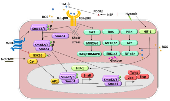 Molecular pathways involved in the endothelial-to-mesenchymal transition (EndMT) regulation. These include transforming growth factor (TGF)-β, TNF-α, BMP, FGF, IL-1 β, Notch, WNT signaling, oxidative stress, and shear stress. TGF-β-induced EndMT involves the canonical Smad2/3 pathway. Additionally, it can activate Smad-independent pathways (1. Tak1, MKK3/6, JAK/p38MAPK; 2. RAS, MEK1/2, ERK1/2; 3. PI3K, Akt, NF-κB). Hypoxia induces EndMT through the effects of HIF-1α activation of Snail1. Shear stress forces (represented by undulating arrows) induce EndMT through several different molecular mechanisms. Other mechanisms include reactive oxygen species (ROS) generation and activation of NF-κB followed by the PI3K, resulting in the increased production and accumulation of ROS (yellow stars). A high level of glucose acts as an ERK1/2 activator and, therefore, regulates the EndMT.
