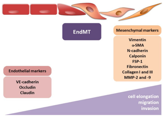 During EndMT, endothelial cells lose their typical phenotype and acquire mesenchymal features, characterized by a shift in endothelial markers toward mesenchymal ones (Figure 3). However, identifying CAFs, it should be remembered that despite many CAF biomarkers, none of them are specific to CAFs [44]. Their expression depends on the cancer type and probably the organ undergoing fibrosis. The endothelial markers commonly include PECAM (CD31), von Willebrand factor (vWF), VE-cadherin (CD144), tyrosine kinase with immunoglobulin-like and EGF-like domains 1 and 2 (TIE1 and TIE2), eNOS, and platelet-derived growth factor (PDGF). To confirm the occurrence of the EndMT, the most often detected mesenchymal markers include α-smooth muscle actin (α-SMA), N-cadherin, calponin, fibroblast-specific protein-1 (FSP-1), vimentin, fibronectin (FN), collagen types I and III, and matrix metalloproteinase 2 and 9 (MMP-2 and MMP-9, respectively). It should be mentioned that other frequently used typical EMT markers, such as E-cadherin, claudin, occludin, and cytokeratin, are not usually used in studies of EndMT [46,47].