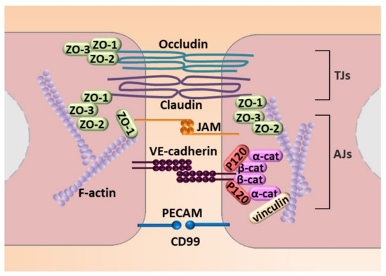 Molecular mechanisms engaged in endothelial cell–cell junction. The figure illustrates adhesion molecules that regulate AJs that consist of VE-cadherin with zonula occludes-1, -2, and -3 (ZO-1, ZO-2, and ZO-3) that interact with a complex of P-120, and a α-cathenin and β-cathenin (α-cat and β-cat, respectively) complex that connects VE-cadherin to stress fibers created by fibrillar actin (F-actin). TJs are created by occludin and claudin and JAM that interacts with ZO-1, ZO-2, and ZO-3. An additional element of cell–cell contact is the PECAM.