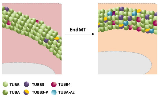 Microtubules reorganization during EndMT. EndMT is accompanied by the upregulation of β3-tubulin (TUBB3) and β4-tubulin TUBB4, as well as increased phosphorylation of β3-tubulin and acetylation of α-tubulin subunits (detailed description in manuscript).