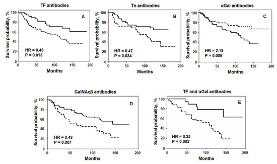 The relation of the preoperative AG Abs level to the survival rate of patients with gastrointestinal cancer. Solid line: level of serum AG Abs above or equal to the median; dashed line: the level below the median. (A,C) all patients; (B) patients with well and moderately differentiated G1-2 tumours; (D) patients with T2-4 size of the primary tumours. (E) the probability of survival assessed by two parameters: patients with increased anti-TF and decreased anti-αGal Abs level (solid line) vs. patients with decreased anti-TF and increased anti-αGal Abs level (dashed line). HR: hazard ratio. Adapted from [20,21]. (Under Creative Commons Act License).